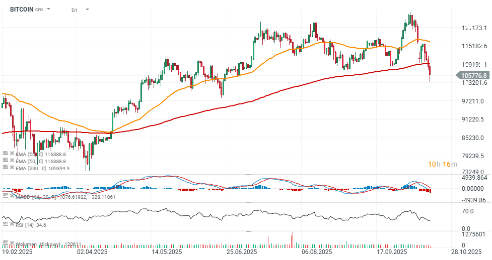 Cena Bitcoina spada dziś o ponad 2% i testuje okolice 105 tys. USD, poniżej EMA200 (czerwona linia), która 'symbolicznie' oddziela trend spadkowy od wzrostoweg. Kluczowy opór zlokalizowany jest teraz napoziomie ok. 110 tys. USD, gdzie EMA200 zmieniła się w opór.