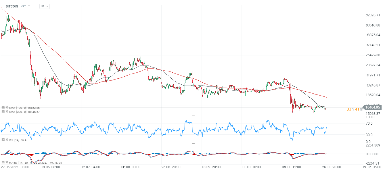 Kryptowaluty próbują odreagowywać spadki z ostatnich dni. Wsparcie Bitcoina przy 16 000 USD wytrzymało i dziś byki wznoszą cenę głównej kryptowaluty wyżej, w okolice 16 500 USD gdzie krótkoterminowo znajduje się kluczowa strefa popytu i podaży.