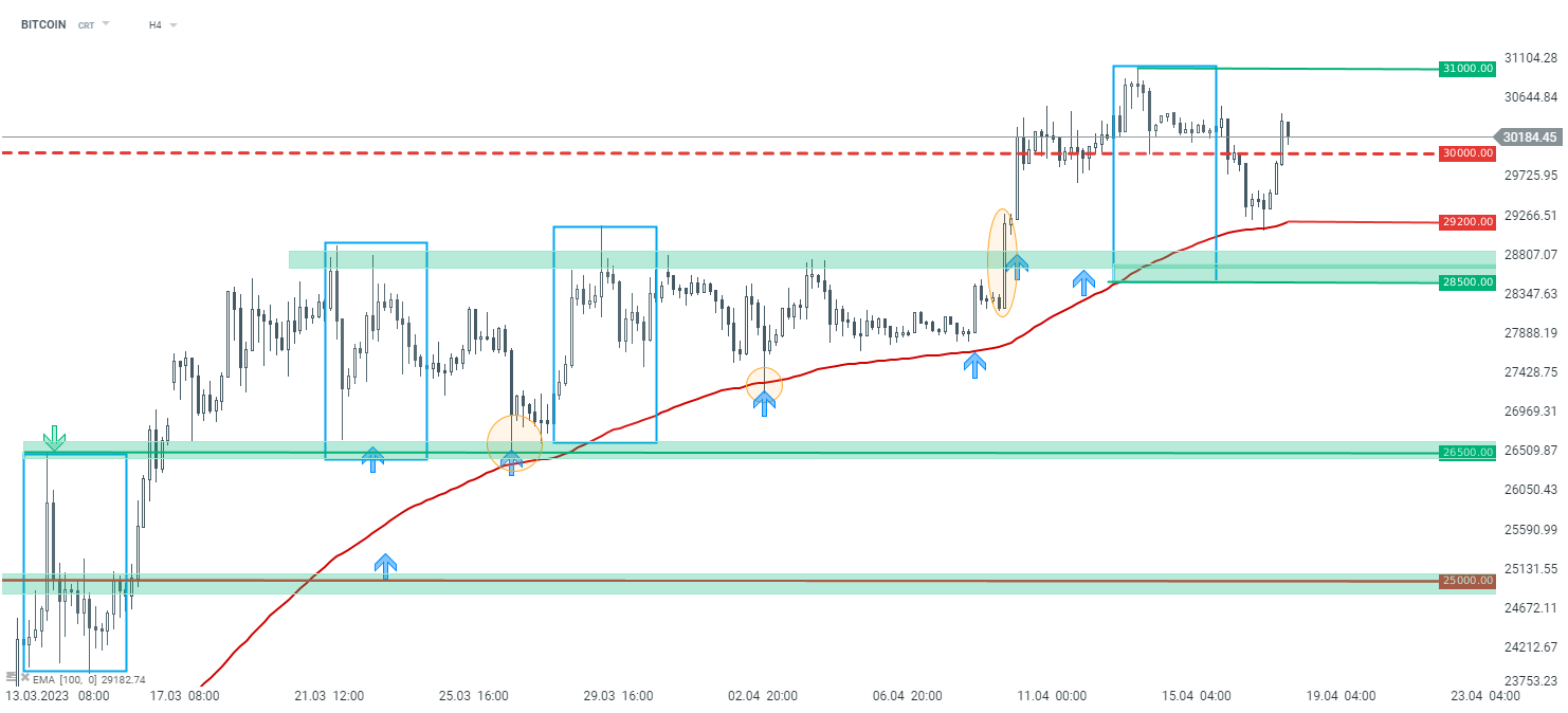 Notowania głównej kryptowaluty zaliczyły w ostatnim czasie lokalną korektę spadkową. Kurs Bitcoina spadł poniżej bariery 30 tys. USD, jednak bardzo szybko wrócił powyżej niej. Patrząc na interwał H4 notowania odbiły się od średniej EMA100, w rejonach 29200$, która to wcześniej także sprawdzała się jako wsparcie. Aktualnie niewykluczony jest więc powrót do trendu wzrostowego. W przypadku takiego scenariusza możliwy jest test poziomu 31 tys. USD. Z drugiej strony, gdyby korekta spadkowa się przedłużyła, jako kolejne ważne wsparcie należy traktować strefę przy 28500$, która wynika z wcześniejszych reakcji cenowych i dolnego ograniczenia układu 1:1.