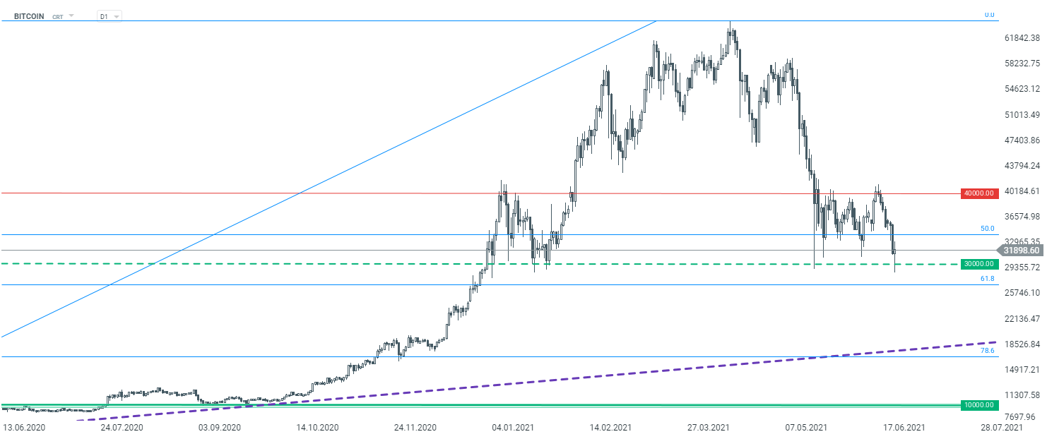 Bitcoin broni poziomu 30 tys. USD. Poprzednio poziom ten został przełamany w maju oraz kilkukrotnie w styczniu. Obecnie obserwujemy odbicie o prawie 2,5 tys. dolarów powyżej wspomnianego poziomu. Niemniej odbicie nie jest powiązane z pojawieniem się jakichś pozytywnych informacji. Bitcoin spadł poniżej 30 tys. USD ze względu na kolejne informacje napływające z Chin, które dotyczą próby ograniczenia płatności za pomocą kryptowalut.