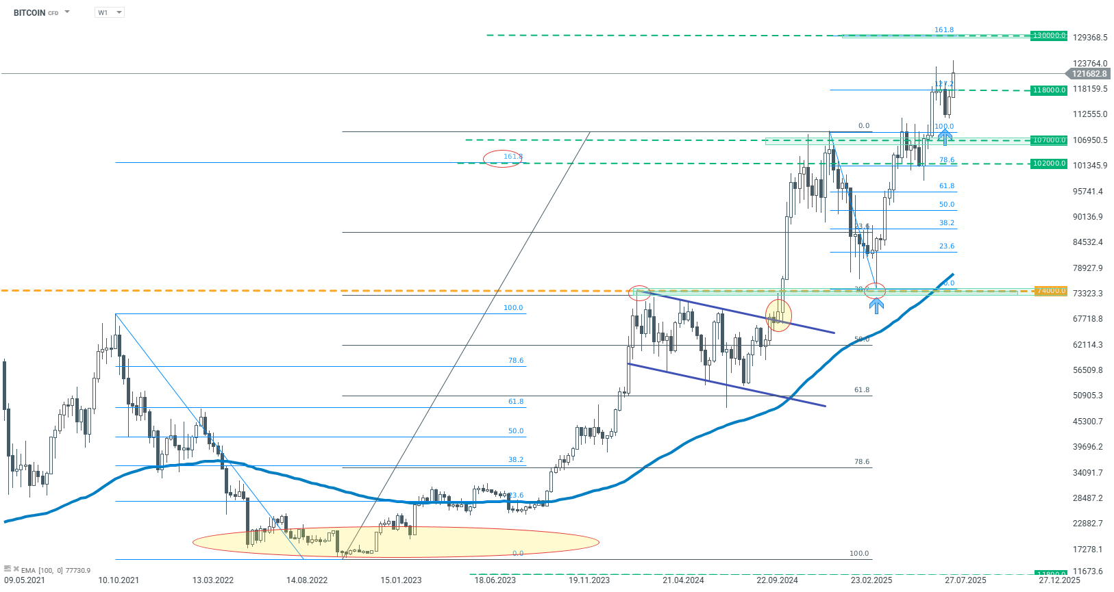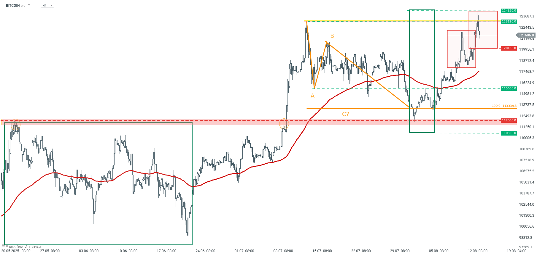 Patrząc na niższy przedział czasowy - H4, doszło do nabicia wierzchołka z 14 lipca, po czym cena szybko wróciła poniżej 123120$. Jeżeli korekta się przedłuży, jako najbliższe wsparcie należy traktować poziom 120135$, gdzie wypada dolne ograniczenia lokalnego układu 1:1 - czerwone prostokąty. Gdyby jednak spadki były silniejsze, kluczowym wsparciem pozostają okolice 112000, gdzie wypadają ostatnie reakcje cenowe - strefa zaznaczona kolorem czerwonym. Wcześniej warto także zwrócić uwagę na średnią EMA100.
