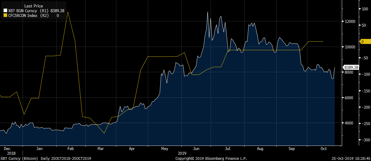 Jak wygląda obecnie pozycjonowanie na Bitcoinie? Nie widać przewagi żadnej ze stron, choć sama dynamika sugerowałaby pozytywne nastawienie na kryptowalucie patrząc na okres od początku tego roku. Źródło: Bloomberg
