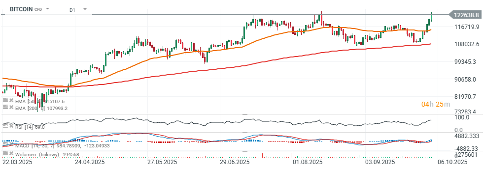 Cena Bitcoina rośnie dziś powyżej 122 tys. dolarów i zbliża się do istotnego poziomu oporu, przy 123 tys. USD skąd dwukrotnie wcześniej uruchamiane były impulsy sprzedażowe. W ostatnim czasie Bitcoin odbił się od okolic EMA200 przy 108 tys. USD i 'wyrysował' formację podwójnego dna, która wspiera scenariusz wzrostowy. Istotnym wsparciem jest obecnie EMA50 przy 115 tys. dolarów.