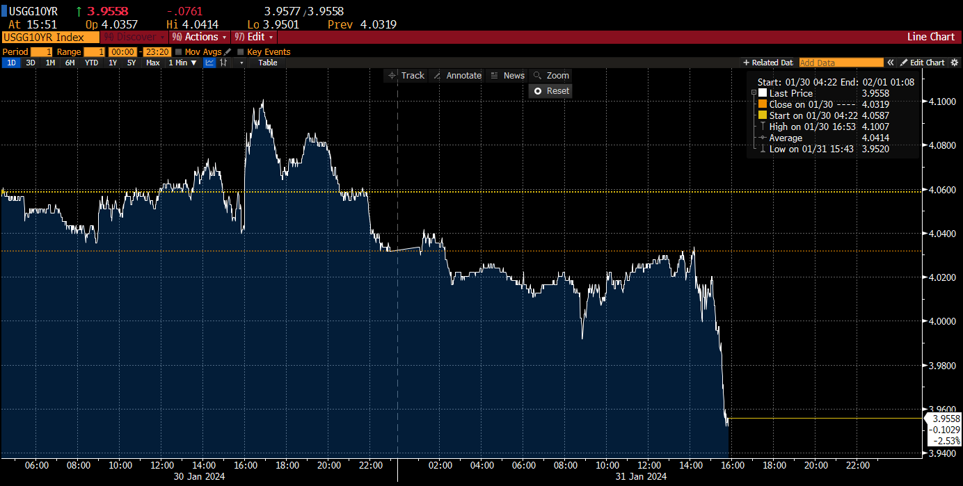 - Rentowności amerykańskich 10-letnich obligacji odnotowały bardzo dynamiczny spadek do 3,95% z okolic bliskich 4,03%. Ruch ten jest o tyle ciekawy, że ma miejsce tuż przed konferencją Fed (20:00) w czasie, gdy walory regionalnego banku New York Community Bancorp (NYCB.US) tąpnęły dziś o prawie 40%.