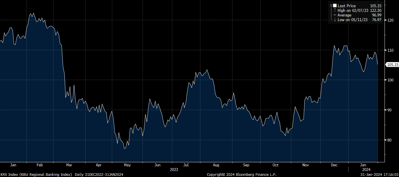 Indeks regionalnych banków KRX Index (KBW Regional Bankin Indx) notuje dziś relatywnie niewielkie spadki. Źródło: Bloomberg Finance LP