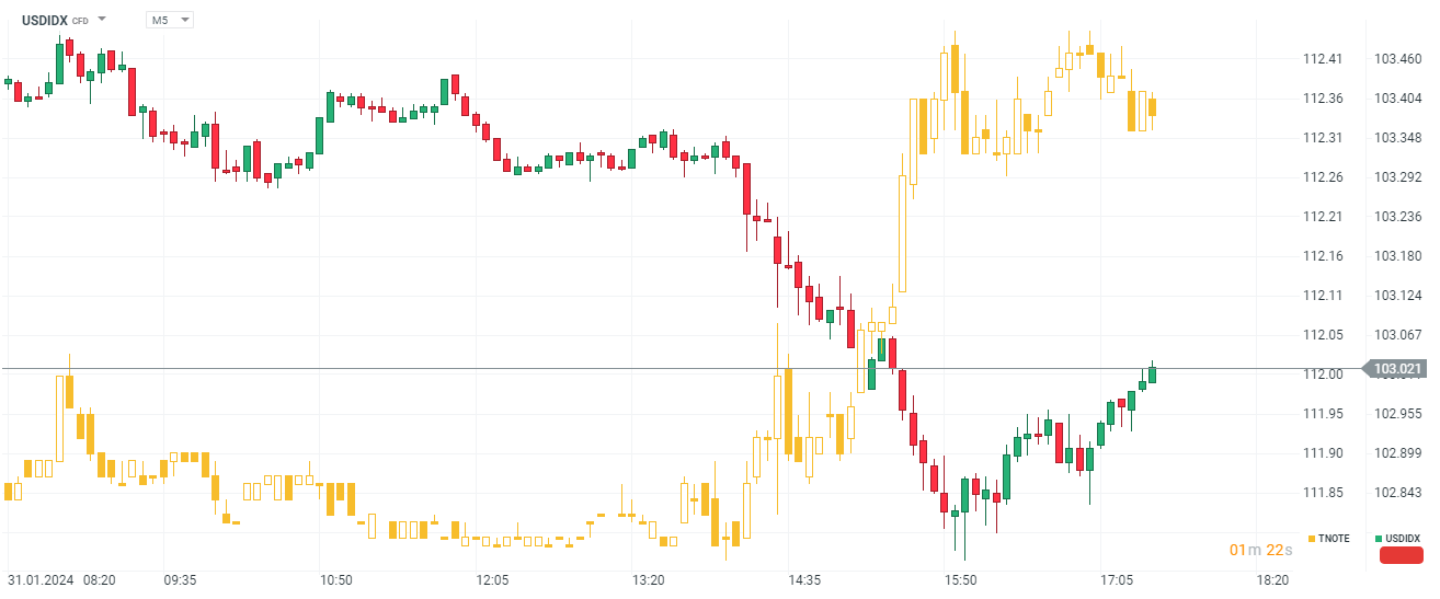 Indeks dolara (USDIDX) odnotował dynamiczne spadki, w czasie gdy (TNOTE) obligacje wzrosły wsparte spadkiem rentowności. Teraz dolar amerykański próbuje się ustabilizować. Źródło: xStaiton5