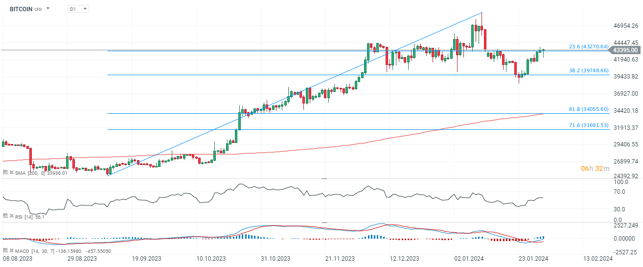 Bitcoin zdołał dziś pokonać opór w postaci 23,6 zniesienia Fibonacciego fali wzrostowej z sierpnia 2023 roku i notowany jest w okolicach 43,500 USD. Potencjalne utrzymanie powyżej kluczowej strefy 43,000 USD może wskazywać na zbliżający się test poziomu 46,000 USD. W scenariuszu odwrotnym, gdyby problem NYCB nie rozlał się na pozostałe banki w USA, możemy być świadkiem korekty nawet do 34,000 USD (SMA200, 61,8 Fibo)