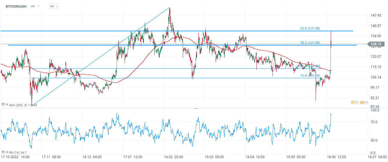 Patrząc na wykres BITCOINCASH na interwale H4 widzimy, że cena wybiła się dynamicznei powyżej SMA200 (czerwona linia) ale wzrosty ustały na poziomie kluczowego oporu tj. 23,6 zniesienia Fibonacciego fali wzrostowej z jesieni 2022 roku i obecnie testują poziom 38,2 Fibo przy 128 USD. Poziom 138 USD pozostaje główną strefą oporu, wyznaczoną także przez poprzednie reakcje cenowe.