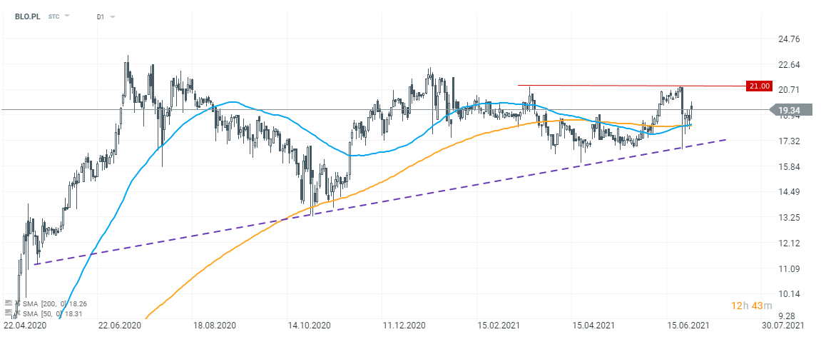 Reakcja na kursie Bloober Team była w pierwszych minutach handlu pozytywna, zwyżka sięgała około 4%. Obecnie wzrosty nie przekraczają jednak 2%. Wydawać by się mogło, że po tego typu komunikacie skok cenowy powinien być znacznie większy - reakcja jest więc cenną wskazówką odnośnie nastrojów tych, którzy obserwują/posiadają spółkę w portfelu, bądź szerzej - obecnych nastrojów na NewConnect. Na wykresie warto zauważyć, że ostatnio kurs oparł się o linię poprowadzoną po dolnych cieniach dziennych świec - jest to potencjalne przyszłe wsparcie. Pierwszą wyraźną przeszkodą dla kupujących może być z kolei poziom 21 PLN, czyli poprzednie lokalne maksima.