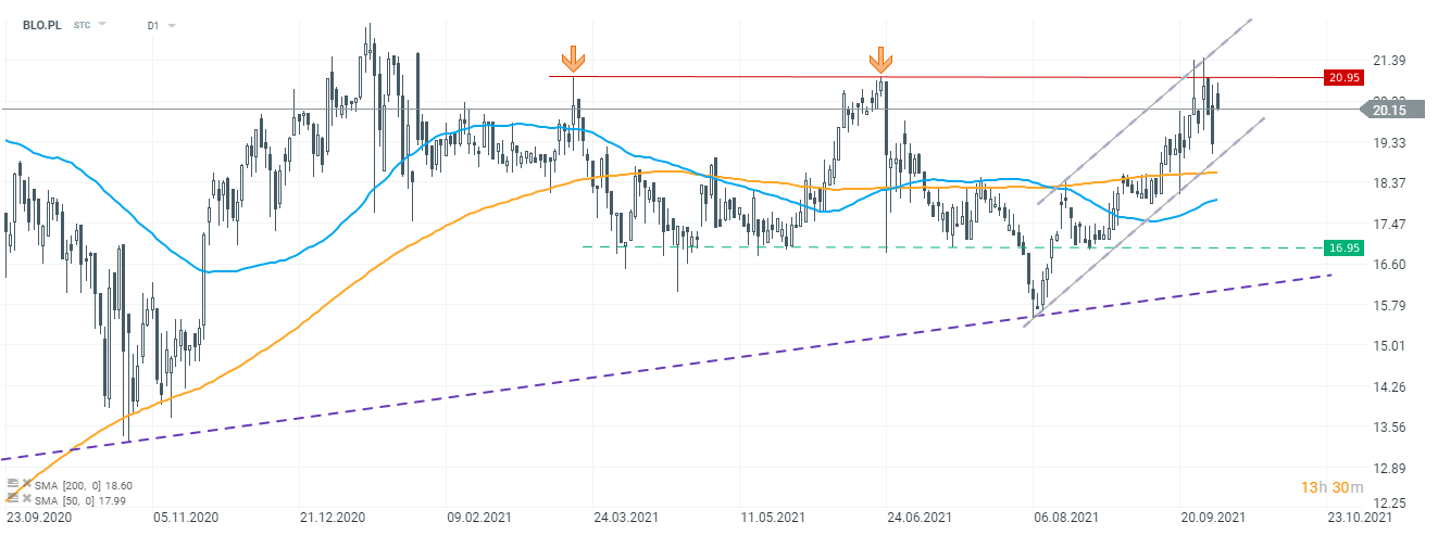 Patrząc na wykres, w ostatnich dniach walory nie były w stanie dokonać wybicia poziomu 20,95 PLN, który obecnie służy jako ważny opór. Dzienne zwyżki powyżej tej bariery kończyły się ostatecznie niepowodzeniem i zamknięciem poniżej. Część dzisiejszego ruchu wzrostowego również została już zredukowana. Niemniej w krótkim terminie kurs wciąż porusza się wewnątrz lokalnego kanału wzrostowego. Wsparciem, od którego cena odbiła się w drugiej połowie sierpnia, jest strefa w pobliżu 16,95 PLN.