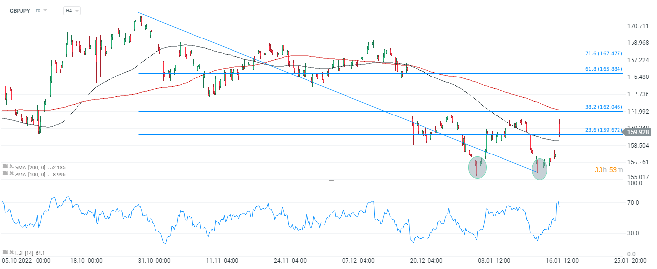 Wykres GBPJPY, interwał H4. Patrząc na wykres widzimy osłabienie jena, cena wybiła byczą formację podwójnego dna w okolicach 155 - 156 pkt. Ruch w górę osłabł i obecnie widzimy korektę, która zatrzymała się w okolicach 23,6 zniesienia Fibonacciego skąd potencjalnie może zostać uruchomiony kolejny impuls wzrostowy w kierunku 162 pkt. To na tych poziomach przebiega SMA200 (czerwona linia), która zbiega się z 38,2 zniesieniem Fibo fali spadkowej rozpoczętej w październiku. Poziomy te mogą stanowić kolejny opór dla byków. Źródło: xStation5