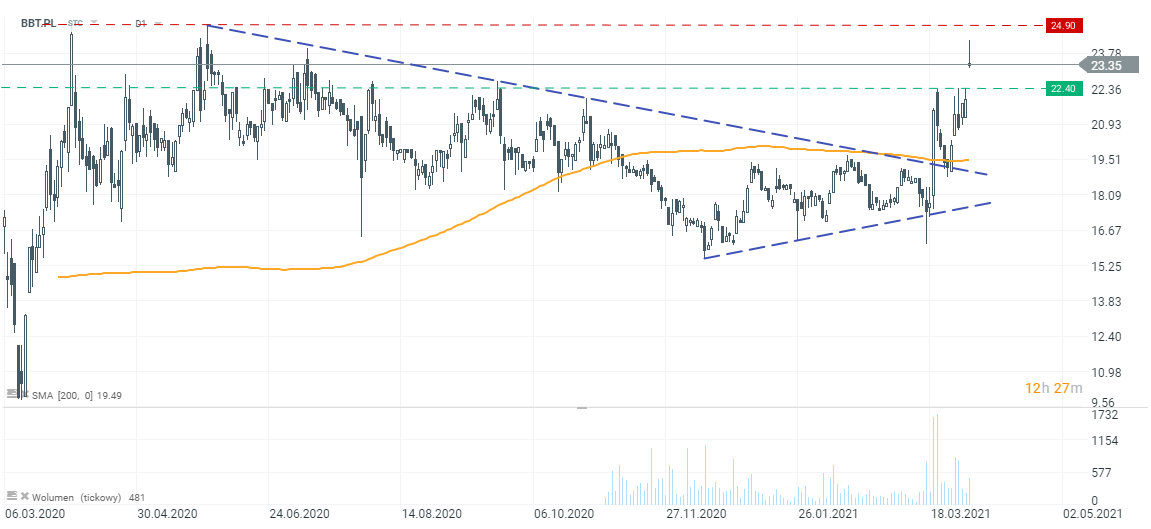 Kurs spółki otworzył się dziś od dużej luki wzrostowej, a na krótko po otwarciu zwyżka przekraczała nawet 11%. Później część tych wzrostów została jednak zredukowana i obecnie cena rośnie o około 6%. Ważnym poziomem oporu są okolice 24,90 zł (dwukrotne szczyty intraday z 2020 r.). Za najbliższe wsparcie można z kolei uznać maksima intraday z ostatnich kilku dni (22,40 zł). Warto dostrzec na wykresie, że dynamiczne przebicie linii trendu spadkowego w drugiej połowie marca zostało dokonane przy dużym wolumenie obrotu, co sugerowało zmianę sentymentu. Kilka dni później wspomniana linia trendu posłużyła już jako wsparcie.