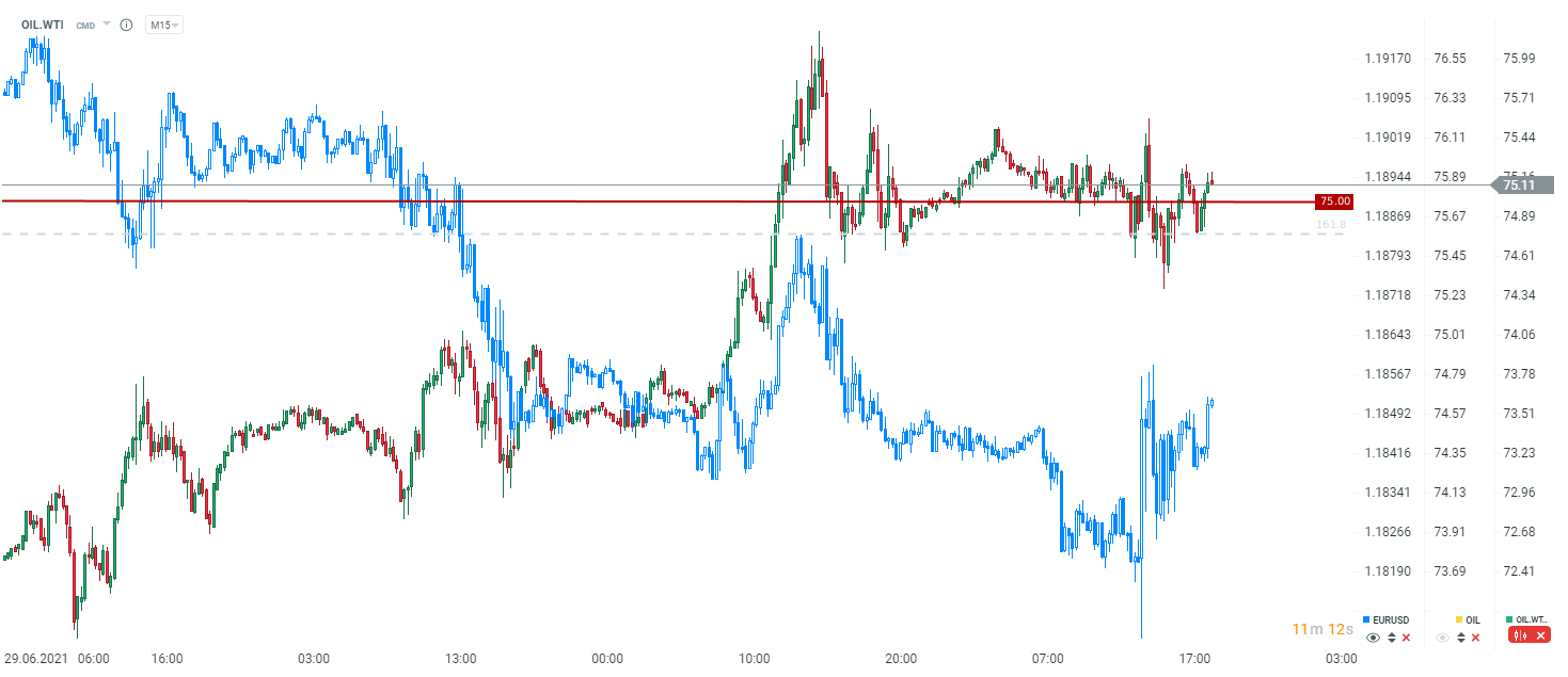 WTI utrzymuje się powyżej 75 dolarów za baryłkę. Teoretycznie brak porozumienia się dobry dla cen, choć z drugiej strony istnieje rosnące ryzyko większej podaży w przypadku osiągnięcia porozumienia. Źródło: xStation5
