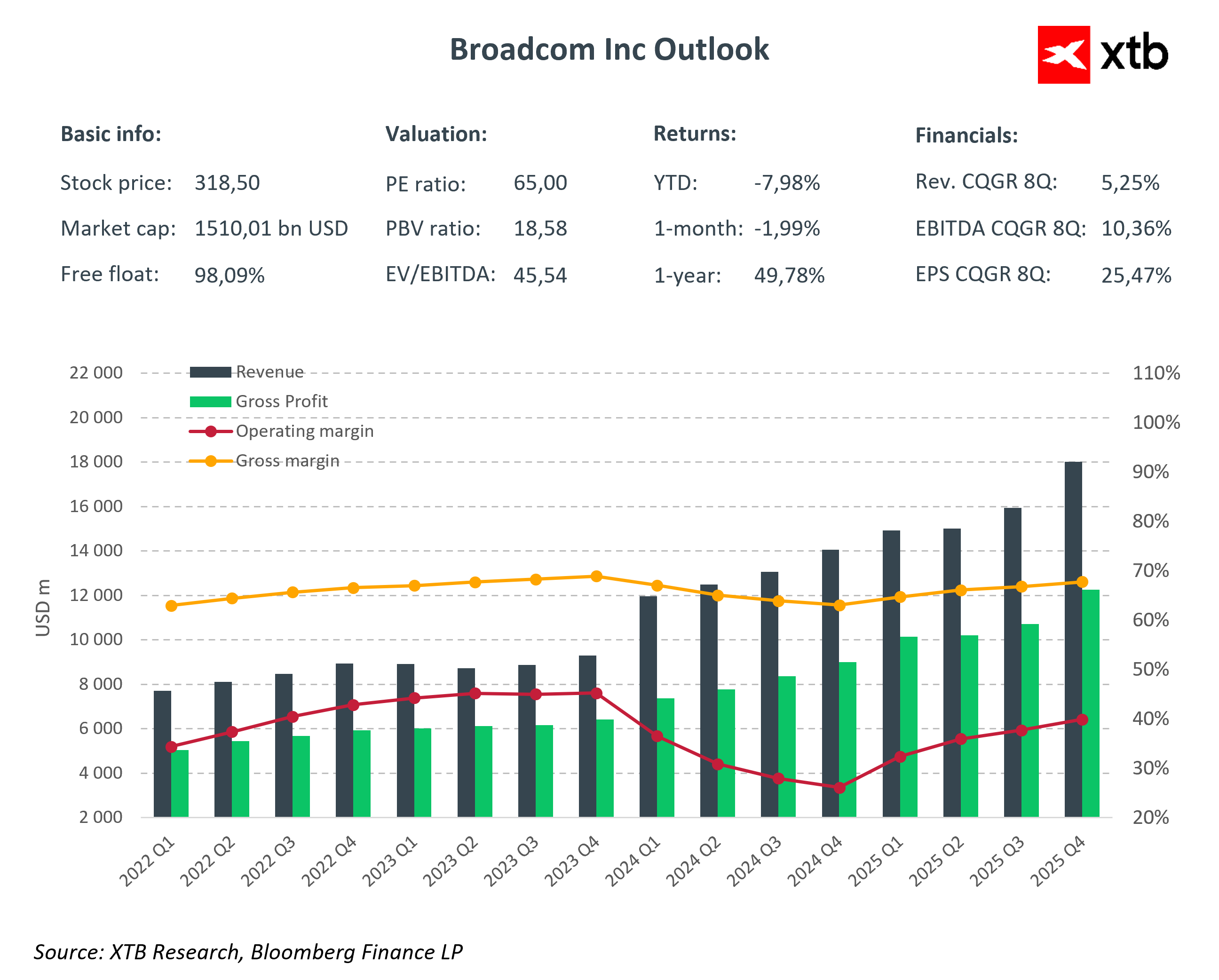 Broadcom Inc. wchodzi w sezon publikacji wyników kwartalnych w roli jednej z najważniejszych spółek półprzewodnikowych, które kształtują rozwój infrastruktury dla sztucznej inteligencji i rozwiązań chmurowych. Spółka opublikuje wyniki po sesji jutro, a oczekiwania rynków są wysokie: obserwują one nie tylko dynamikę przychodów, ale przede wszystkim strukturę wzrostu i zdolność Broadcom do utrzymania wysokich marż w segmencie zaawansowanych układów ASIC oraz oprogramowania infrastrukturalnego. Po ostatnich kwartałach z rekordowymi wynikami sprzedaży układów AI i networkingowych, rynki spodziewają się kolejnego silnego kwartału, ale jednocześnie analizują ryzyka związane z presją kosztową, miksu produktowego oraz ewentualnymi wahaniami popytu w sektorze centrów danych. Wyniki Q1 FY2026 będą testem, czy Broadcom potrafi przekuć rosnący popyt na AI w trwały wzrost przychodów i utrzymanie konkurencyjnej pozycji w branży półprzewodników.