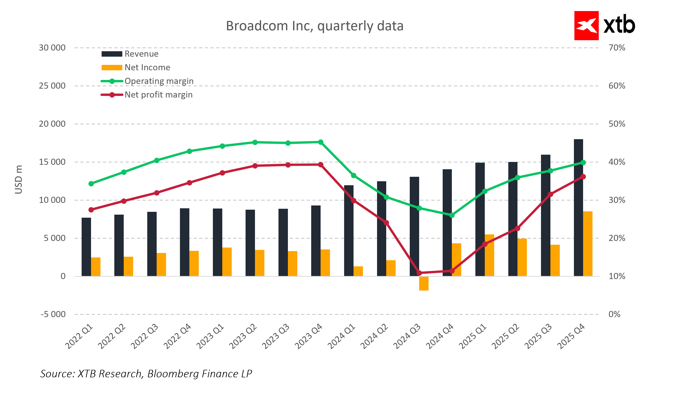 Duże znaczenie będzie miała struktura przychodów. Rynki chcą zobaczyć, ile przychodów pochodzi z produktów AI i układów ASIC, ponieważ pokazuje to, czy wzrost jest trwały i czy spółka skutecznie rozwija segment przyszłościowy.