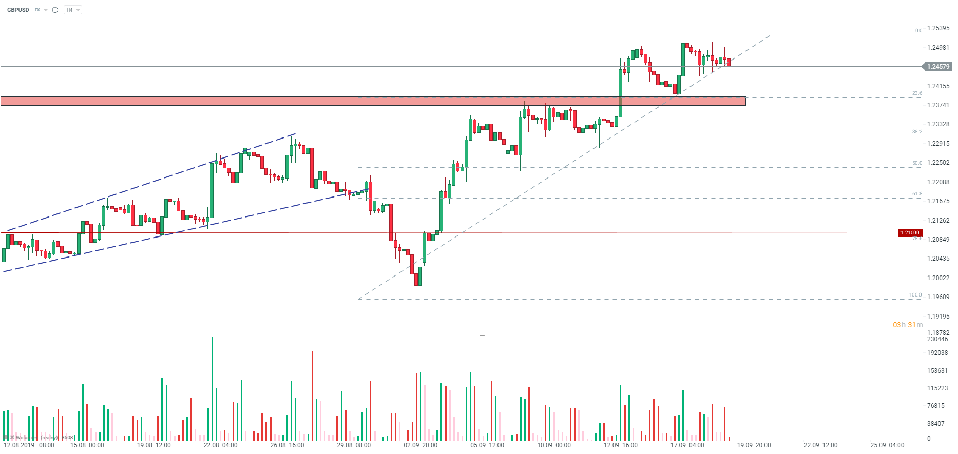 Funt odwraca się minimalnie po pojawieniu się tych informacji. Widać, że poziom 1,2500 stanowi obecnie bardzo mocną barierę dla brytyjskiej waluty. Najbliższe wsparcie zlokalizowane przy poziomie 1,2400. Źródło: xStation5