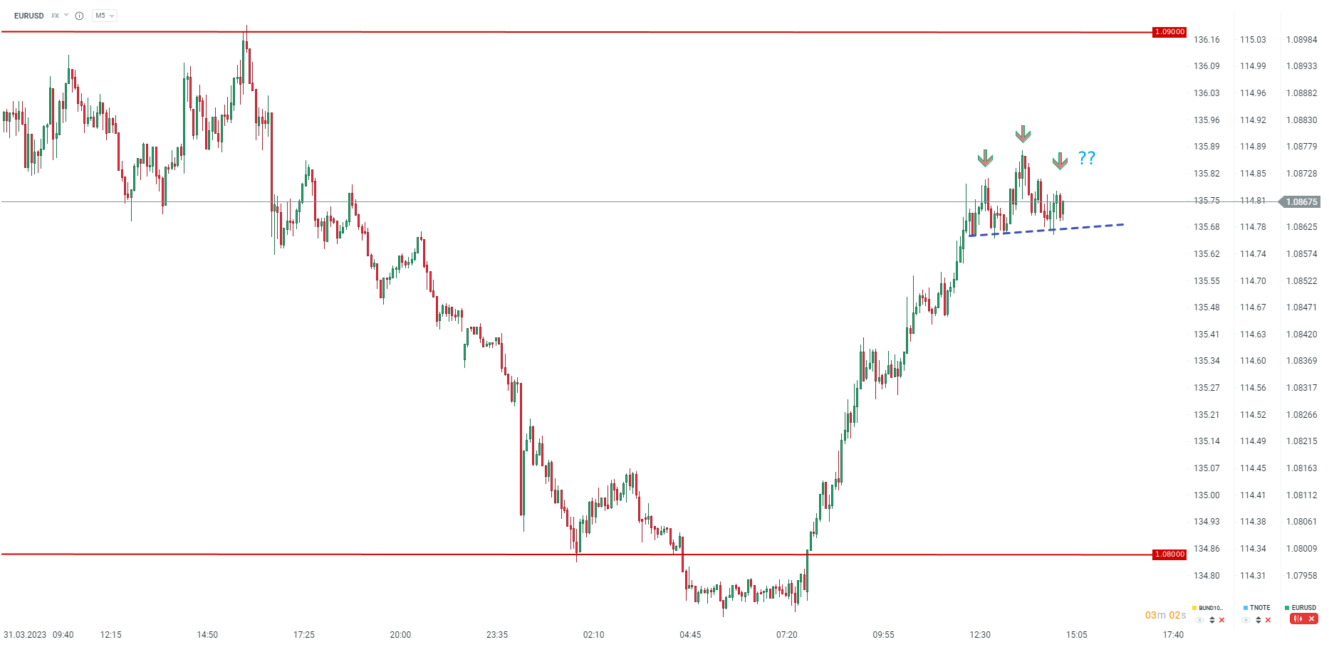EURUSD ma problemy z dalszymi wzrostami i dolar próbował korzystać na jastrzębich słowach Bullarda. Na wykresie na M5 tworzy się potencjalny RGR, ale jego potwierdzenie nastąpiłoby dopiero po przebiciu linii szyi. Źródło: xStation5