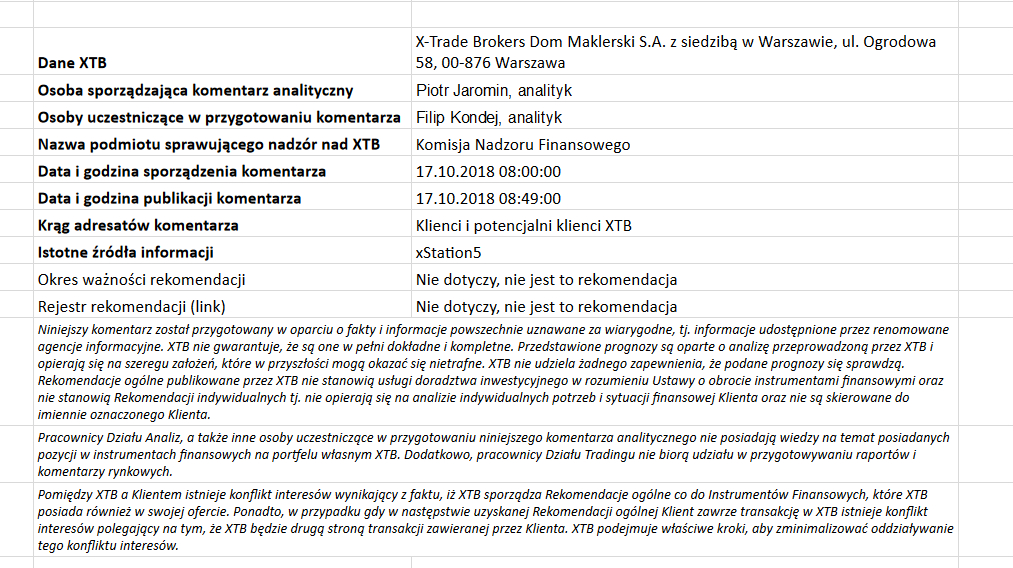 Ta publikacja handlowa jest informacyjna i edukacyjna. Nie jest rekomendacją inwestycyjną ani informacją rekomendującą lub sugerującą strategię inwestycyjną. W materiale nie sugerujemy żadnej strategii inwestycyjnej ani nie świadczymy usługi doradztwa inwestycyjnego. Materiał nie uwzględnia indywidualnej sytuacji finansowej, potrzeb i celów inwestycyjnych klienta. Nie jest też ofertą sprzedaży ani subskrypcji. Nie jest zaproszeniem do nabycia, reklamą ani promocją jakichkolwiek instrumentów finansowych. Publikację handlową przygotowaliśmy starannie i obiektywnie. Przedstawiamy stan faktyczny znany autorom w chwili tworzenia dokumentu. Nie umieszczamy w nim żadnych elementów oceniających. Informacje i badania oparte na historycznych danych lub wynikach oraz prognozy nie stanowią pewnego wskaźnika na przyszłość. Nie odpowiadamy za Twoje działania lub zaniechania, zwłaszcza za to, że zdecydujesz się nabyć lub zbyć instrumenty finansowe na podstawie informacji z tej publikacji handlowej. Nie odpowiadamy też za szkody, które mogą wynikać z bezpośredniego czy też pośredniego wykorzystania tych informacji. Inwestowanie jest ryzykowne. Inwestuj odpowiedzialnie.