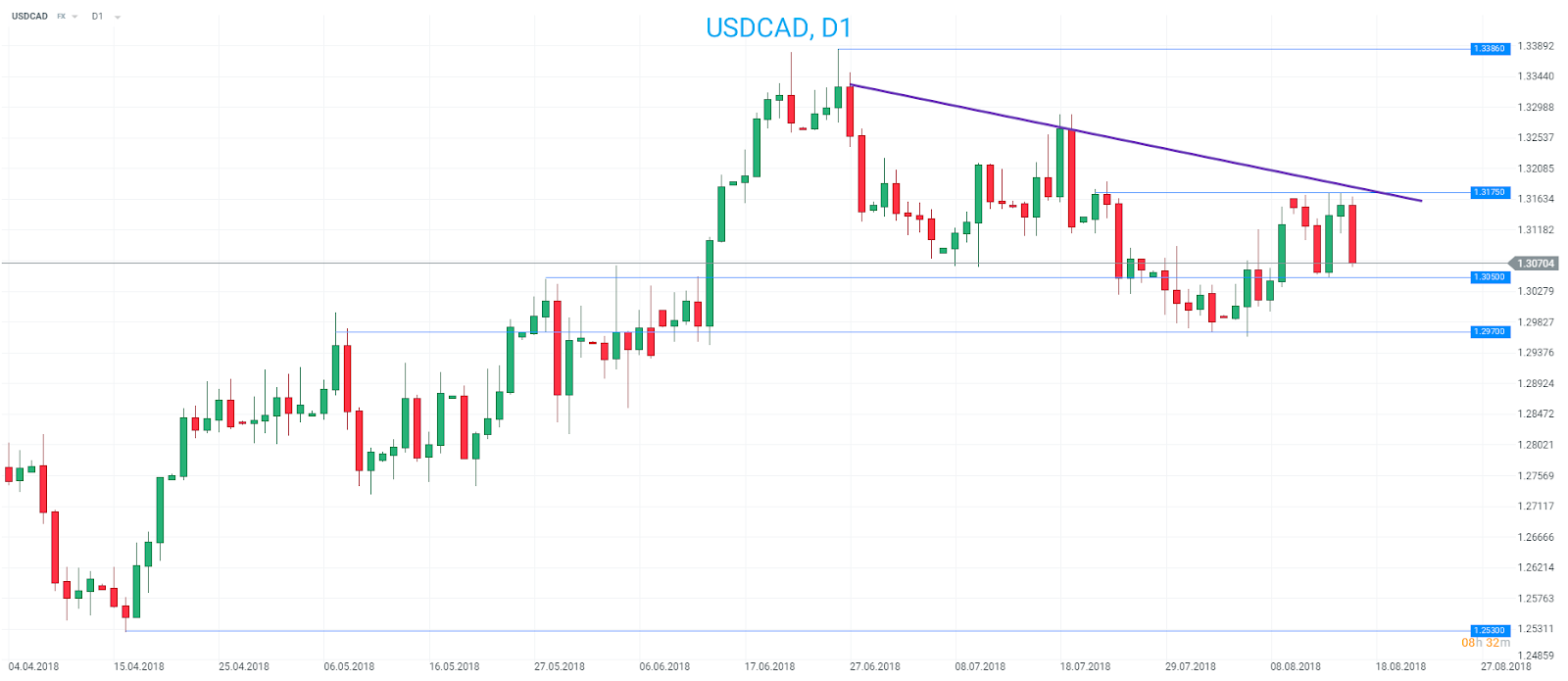 Patrząc na USDCAD z szerszej perspektywy widzimy, że rynek po raz kolejny zareagował na poziom oporu przy 1,3175. Kurs zmierza w kierunku ostatniego dołka przy 1,3050. Para walutowa sukcesywnie wyrysowuje niższe dołki i szczyty, jednak prawdziwym testem będzie reakcja na poziom 1,2970. Źródło: xStation5
