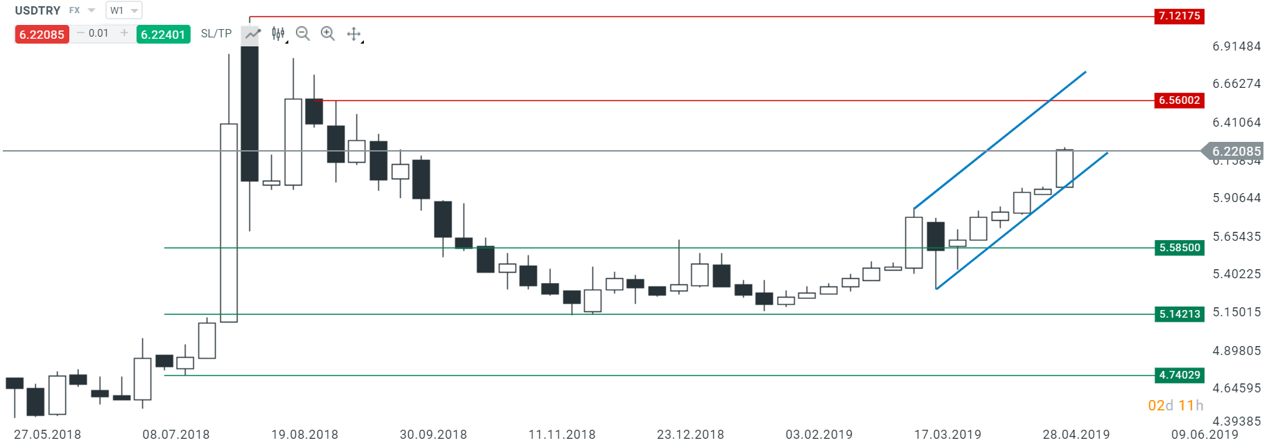 USDTRY wzrósł w tym tygodniu o ok. 4%, co jest największym tygodniowym wzrostem od połowy marca. Z technicznego punktu widzenia lira może kierować się nawet do 6.65. Źródło: xStation5