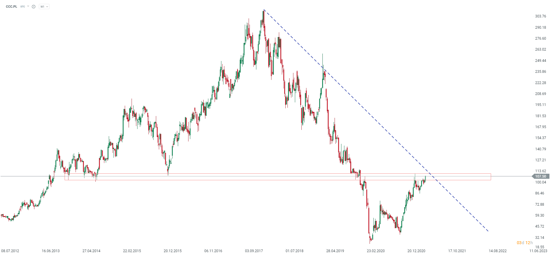 Akcje spółki kolejny raz w tym roku próbują przebić się przez ważną strefę podażową związaną z poziomami 100-110 zł za akcje. Niewiele powyżej znajduje się linia trendu spadkowego. Spółka znajduje się już w okolicach, w których znajdowała się przed pandemią. jest to jednak miejsce dalekie od historycznych szczytów przy poziomi 300 zł za akcje. Źródło: xStation5