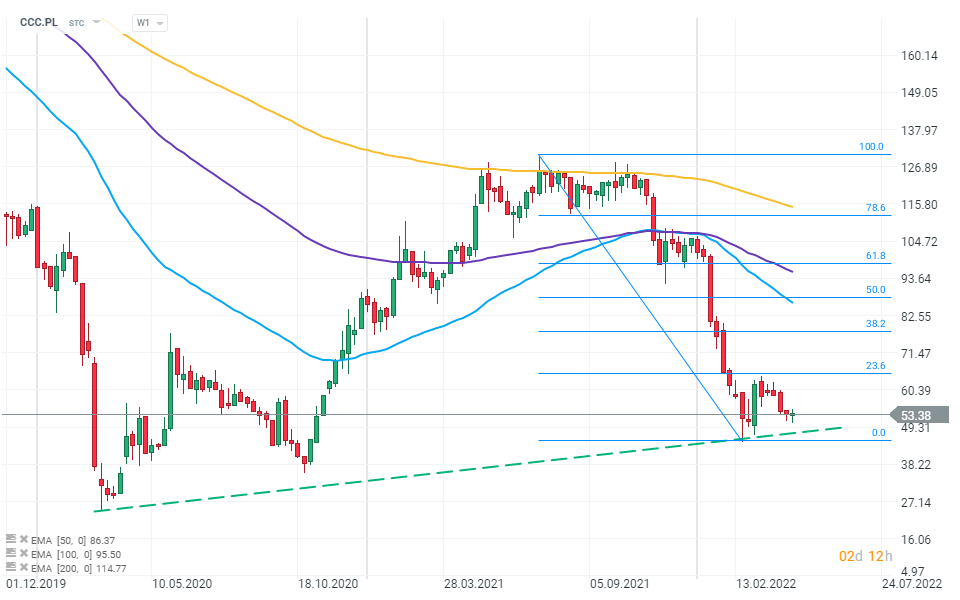 Wykres walorów spółki CCC (CCC.PL), interwał W1. Strona popytu pozytywnie zareagowała na wczorajszą publikację wyników finansowych i walory spółki zwyżkują dzisiaj o ponad 2%. Z szerszego punktu widzenia, akcje znajdują się obecnie blisko wsparcia wyznaczonego przez długoterminową linię trendu wzrostowego (zielona, przerywana linia). Za najbliższe ważne opory można uznać rejon 65 zł za akcję, gdzie przebiega zniesienie 23,6% Fibo oraz lokalny szczyt z 14 marca 2022 roku. Źródło: xStation 5