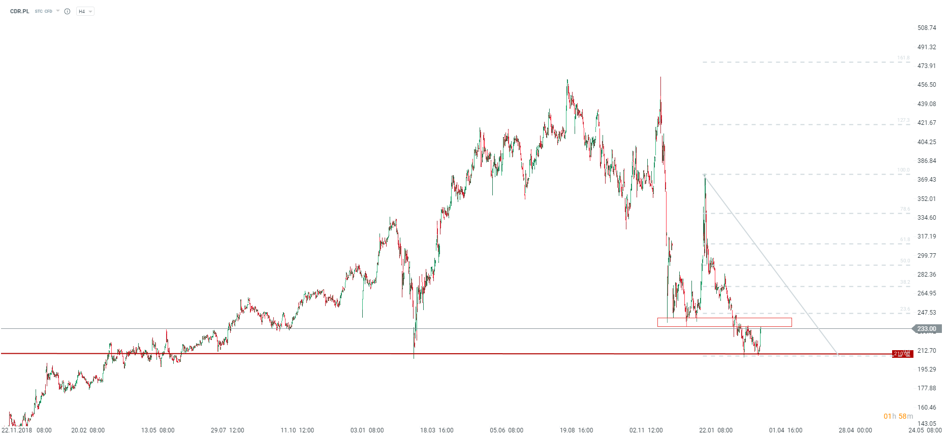 Cena akcji wyrysowała podwójny dołek w okolicach poziomu 210 zł za akcje. Warto zauważyć, że było to również dno dla akcji po wyprzedaży globalnej z marca 2020 roku. Akcje rosną dzisiaj 10% i notowane są powyżej 230 zł. Niemniej widać, że przed ceną silny opór powiązany z poziomem 240 zł za akcje. Obserwujemy w tym miejscu lokalne dołki z połowy grudnia oraz początku stycznia. Widać również, że w tym miejscu zakończyły się próby odbicia z połowy marca. Strefa ta jest kluczowa wobec potencjalnego powrotu do długoterminowego trendu wzrostowego.
