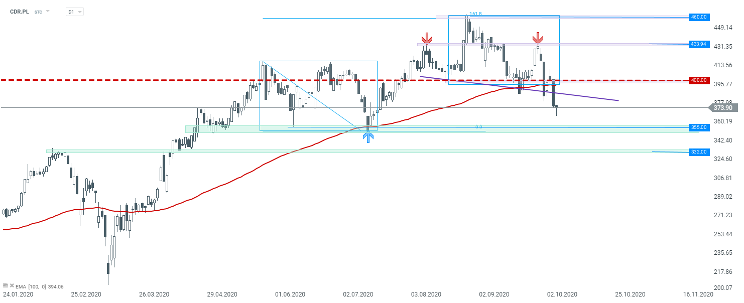 Patrząc technicznie na wykres, kurs utrzymuje się poniżej kluczowej strefy wypadającej w rejonach 400 zł. Miejsce to wynika z dolnego ograniczenia wybitego układu 1:1 oraz średniej z ostatnich 100 okresów. Ponadto na interwale dziennym widać również formację odwrócenia trendu - RGR, która może przemawiać za pogłębieniem przeceny. Niemniej dwa wsparcia znajdują się dość blisko, pierwsze wypada przy poziomie 350 zł, a drugie przy 332 zł. W przypadku zejścia w te okolice, mogą uaktywnić się kupujący.