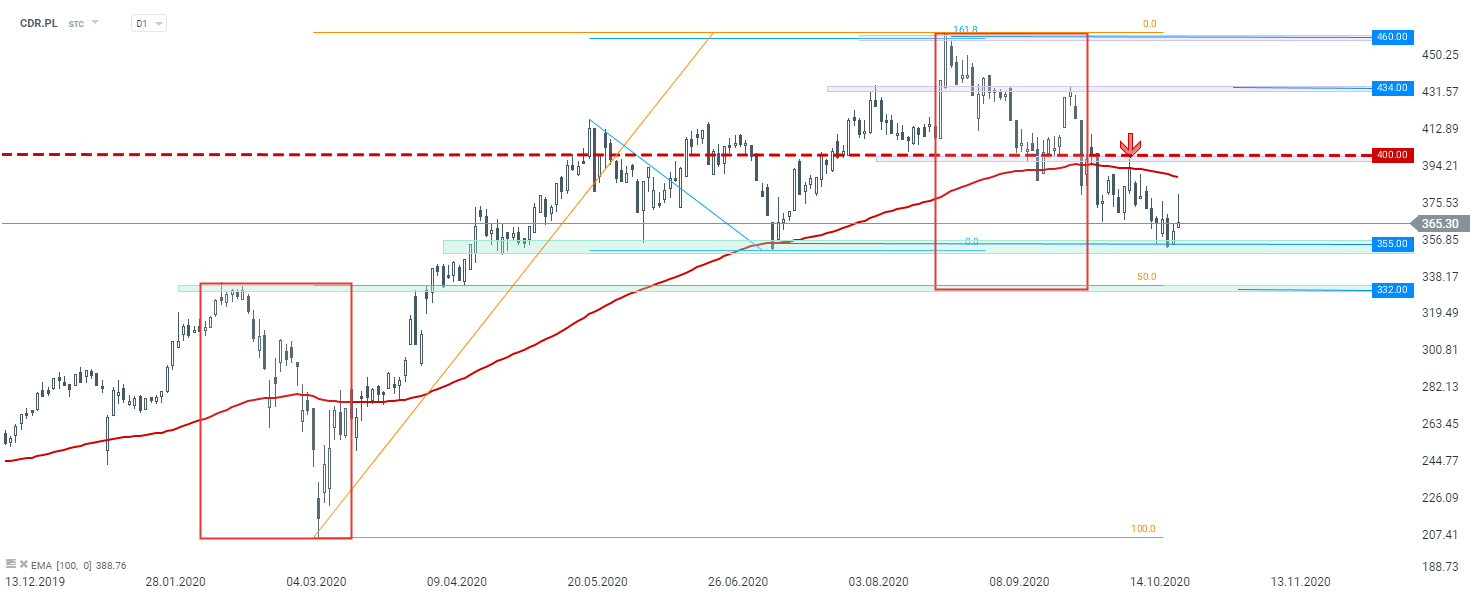 Oczywiście rynek jest teraz zamknięty, jednak jeżeli jutro na otwarciu sesji dojdzie do spadków, jako kluczowe wsparcie należy traktować poziom 332 zł, gdzie znajduje się równość z poprzednią dużą korektę spadkową.