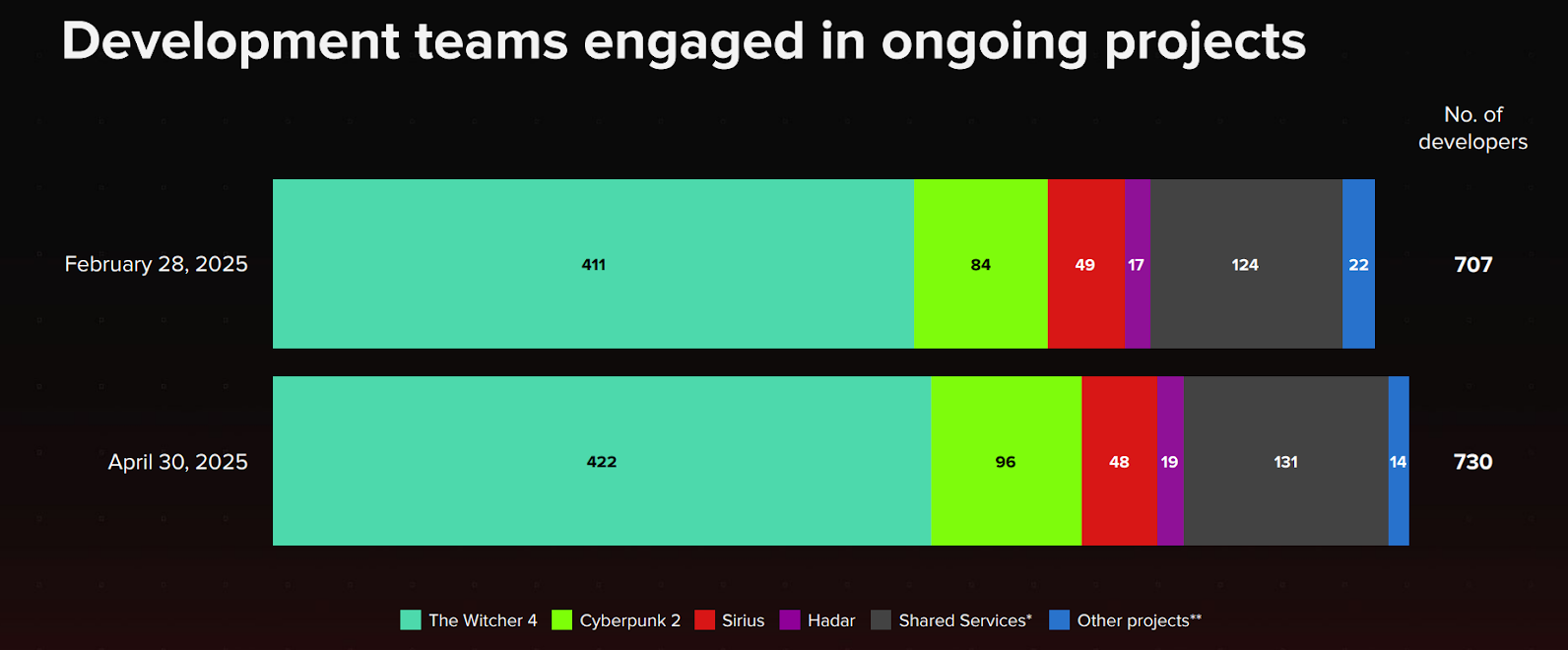 Obecne zestawienie pracy deweloperów nad konkretnymi projektami Studia. Źródło: CD Projekt