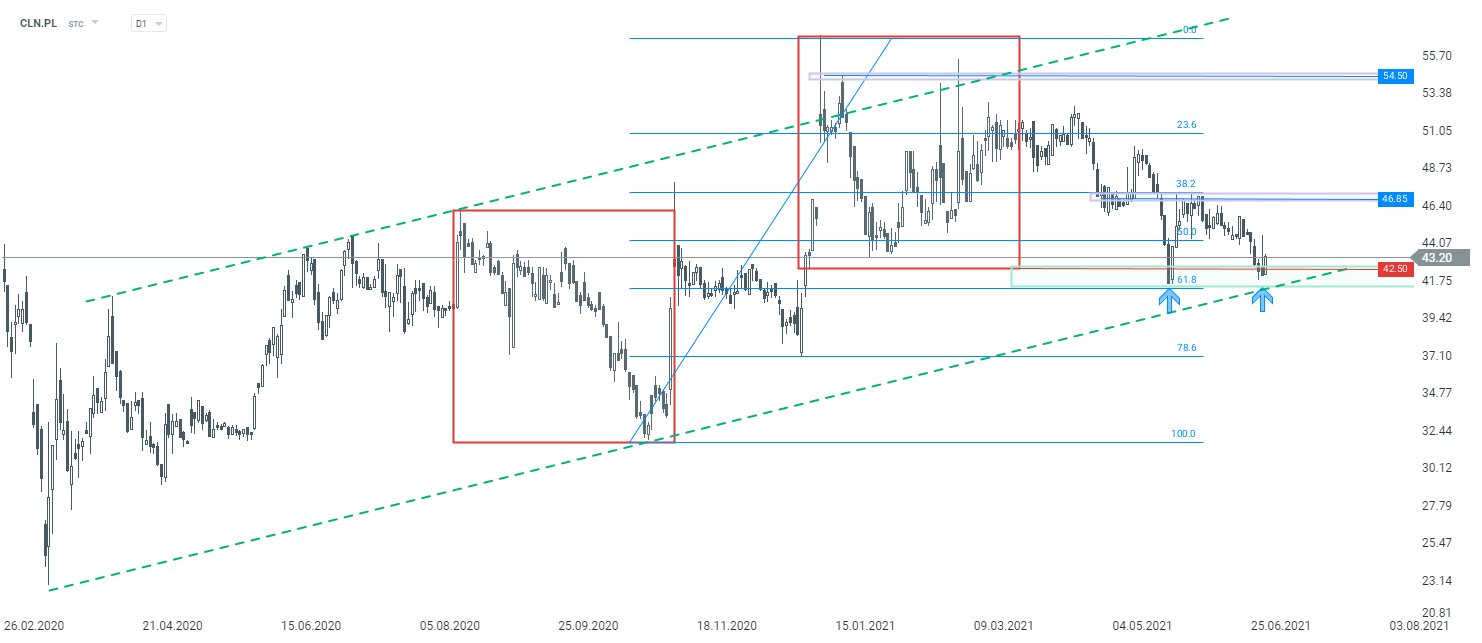 Jeśli chodzi o sytuację techniczną, to patrząc na interwał D1, notowania dotarły do kluczowego wsparcia. Strefa zaznaczona kolorem zielonym w rejonach 42 zł wynika z układu 1:1, mierzenia 61,8% Fibonacciego ostatniej fali spadkowej, jak i dolnego ograniczenia kanału wzrostowego. Jeżeli kupujący zdołają powstrzymać tutaj spadki, niewykluczony jest powrót do wzrostów. W przypadku realizacji takiego scenariusza najbliższy opór powinien stanowić poziom 46,85 zł. Z drugiej strony, jeśli wspomniana strefa przy 42 zł zostałaby zanegowana, przecena może przybrać na sile.