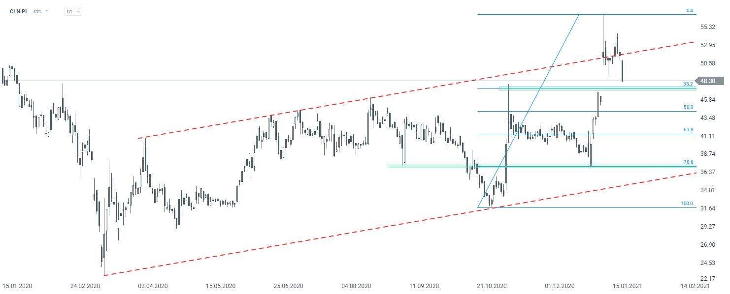 Patrząc na sytuację techniczną na interwale D1, notowania wróciły do środka kanału wzrostowego, co może przemawiać za głębsza korektą. Niemniej warto zauważyć, że już przy poziomie 47,5 zł znajduje się najbliższe ważne wsparcie, które wynika wcześniejszych reakcji cenowych oraz mierzenia 38,2% Fibonacciego. W przypadku jeśli poziom ten zostanie wybity, spadki mogą przybrać na sile.