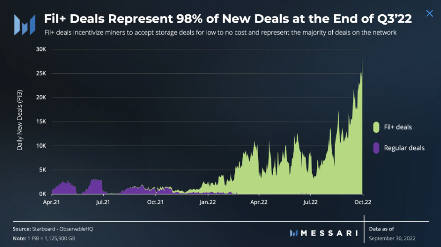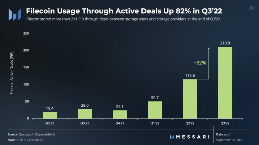 Liczba przechowywanych przez sieć danych wzrosła o imponujące 82% w ujęciu kwartalnym. Źródło: Messari, Filecoin
