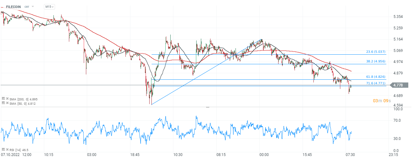 Wykres Filecoina, interwał M15. Cena kryptowaluty znajduje się w okolicach 71.6 zniesienia wg. Fibonacciego, w okolicach 4,78 USD. Przebicie się w dół możę skutkować szybkim przetestowaniem poprzednich minimów w okolicach 4,6 USD. Źródło: xStation5