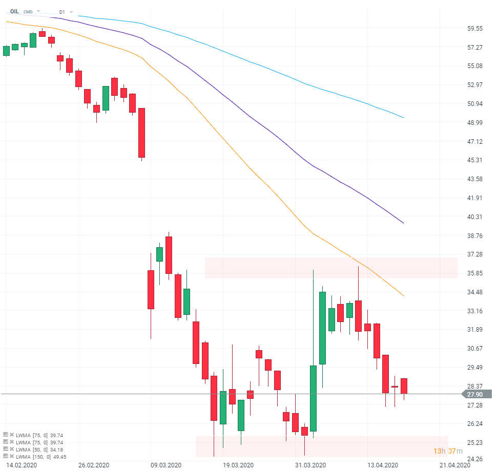 Na globalnych rynkach dominuje obecnie nadzieja na ożywienie gospodarcze, co widać w notowaniach indeksów giełdowych. Inaczej jest jednak na rynku ropy, gdzie ceny nie przestają spadać. Przypomnijmy, że OPEC+ zdecydował o rekordowym cięciu produkcji (blisko 10 mbd w maju i czerwcu), ale wiele wskazuje na to, że będzie ono mniejsze niż spadek popytu wywołany przestojami gospodarczymi. Patrząc na wykres OIL (gatunek Brent) nie widać na razie pozytywnej reakcji na wczorajszy dolny cień, a sekwencja dziennych świec sugeruje, że w grze jest nadal wsparcie w okolicach 25 dolarów.