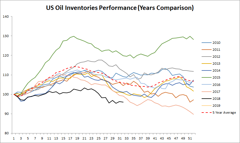 Podczas gdy rynek oczekiwał spadku zapasów o 2,16 miliona baryłek raport DOE pokazał mniejszy spadek na poziomie 1,35 miliona baryłek. Pozostałe składowe raportu są jeszcze bardziej pesymistyczne. Zapasy benzyny wzrosły o 2,9 miliona baryłek przy oczekiwanym spadku o 1,8 miliona, natomiast zapasy destylatów zwiększyły się o 1,23 miliona baryłek (oczekiwano wzrostu o 731 tys.). Jest to o tyle niekorzystna wiadomość dla byków z rynku ropy, że może sugerować niższy popyt na surowiec ze stron rafinerii.