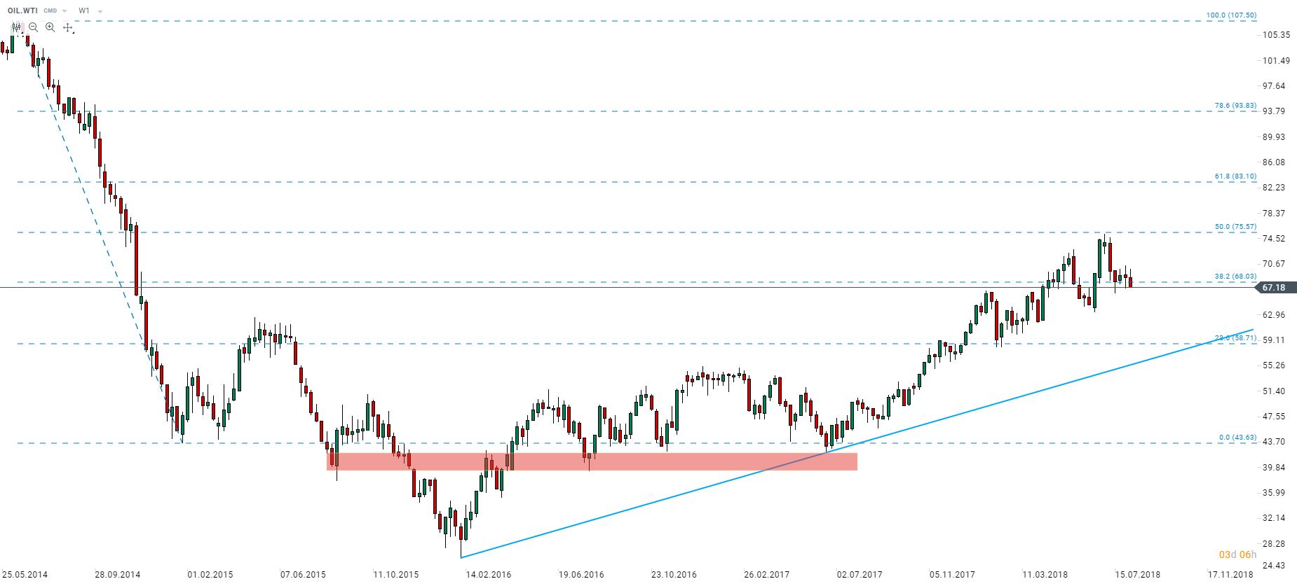Patrząc na OIL.WTI z szerszej perspektywy widzimy, że cena przebija się z powrotem poniżej zniesienia 38,2% impulsu spadkowego rozpoczętego w połowie 2014 roku. W przypadku kontynuacji ruchu spadkowego najbliższym kluczowym wsparciem mogą być okolice poziom 60 USD, gdzie obserwowaliśmy silną akcję cenową w połowie 2015 roku i na początku 2018 roku. Źródło: xStation5