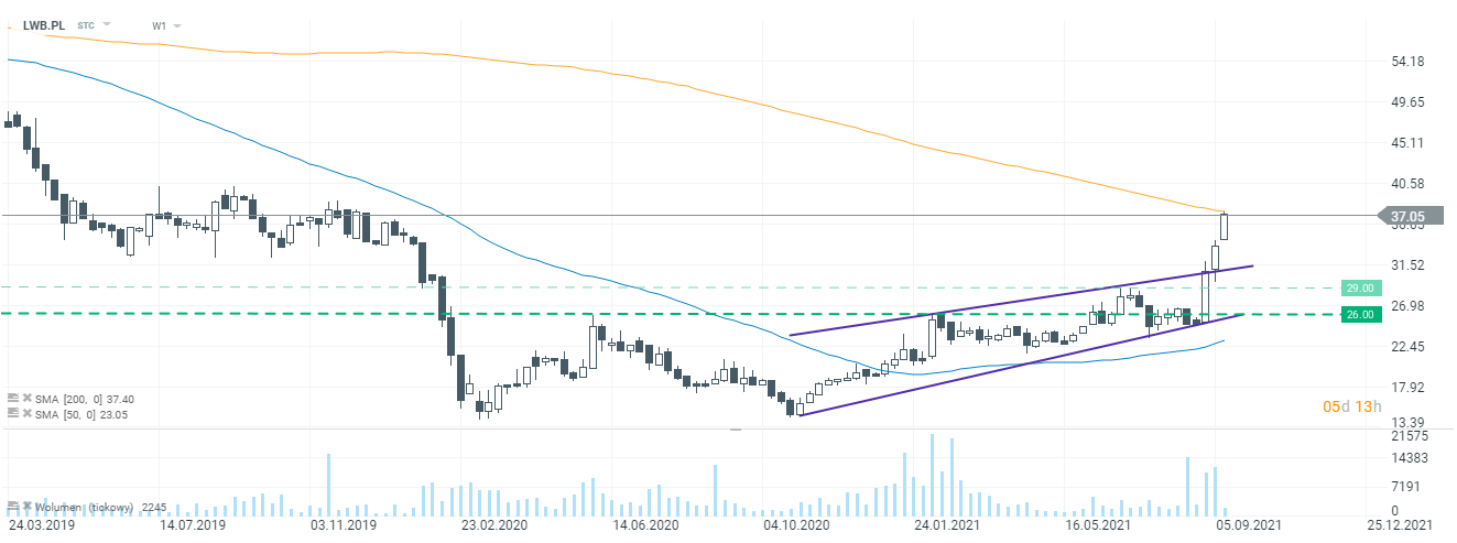 Lubelski Węgiel Bogdanka (LWB.PL) jest w trakcie drugiej bardzo silnej sesji z rzędu. Kurs wyraźnie oddalił się od linii trendu wzrostowego. Warto zwrócić uwagę, że w ostatnich dniach mocno rósł również wolumen. Źródło: xStation5