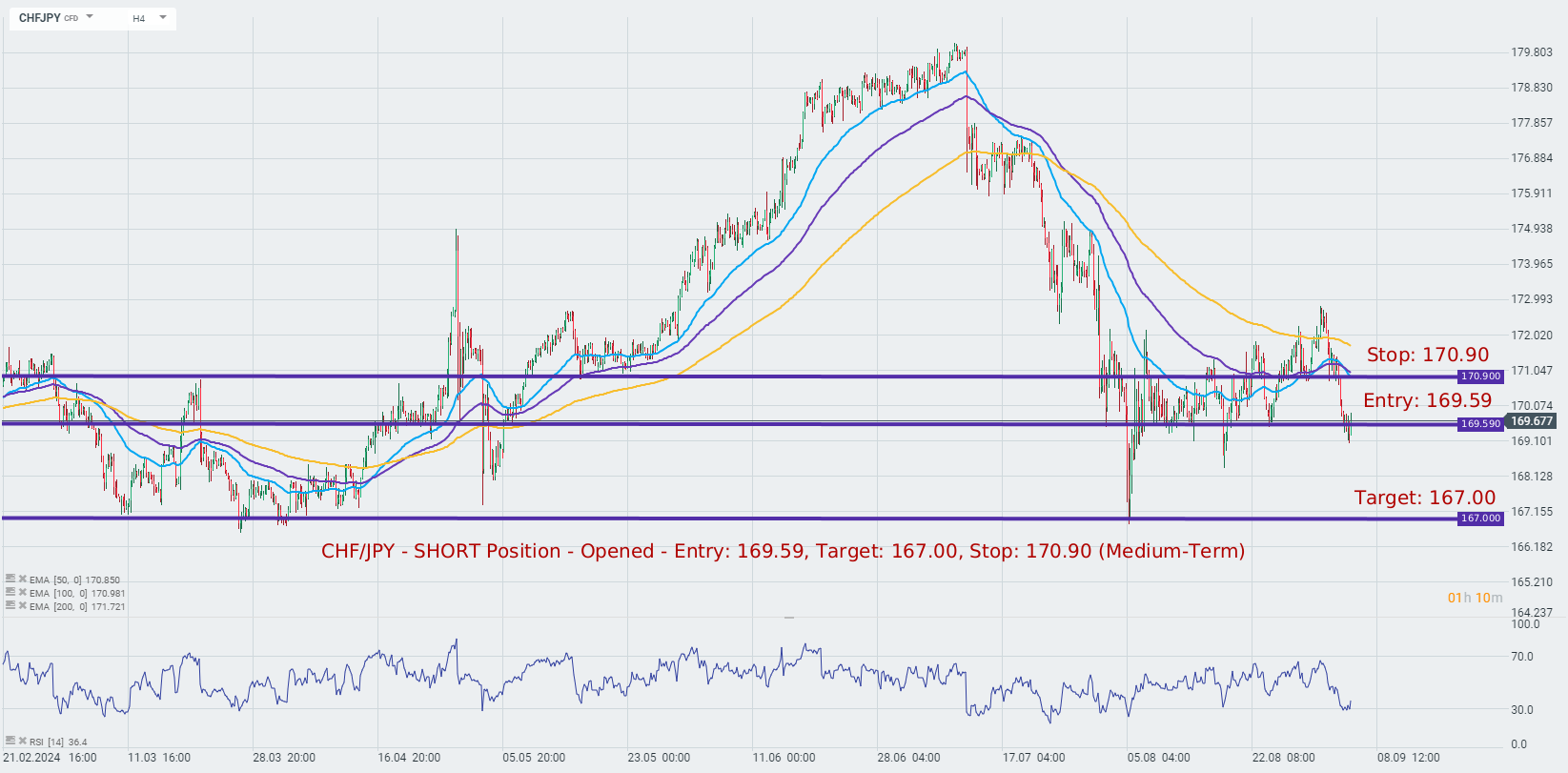 ANZ Research rekomenduje zajęcie krótkiej pozycji na CHFJPY po cenie rynkowej z celem 167,00 i zleceniem Stop Loss na poziomie 170,90. Źródło: xStation5
