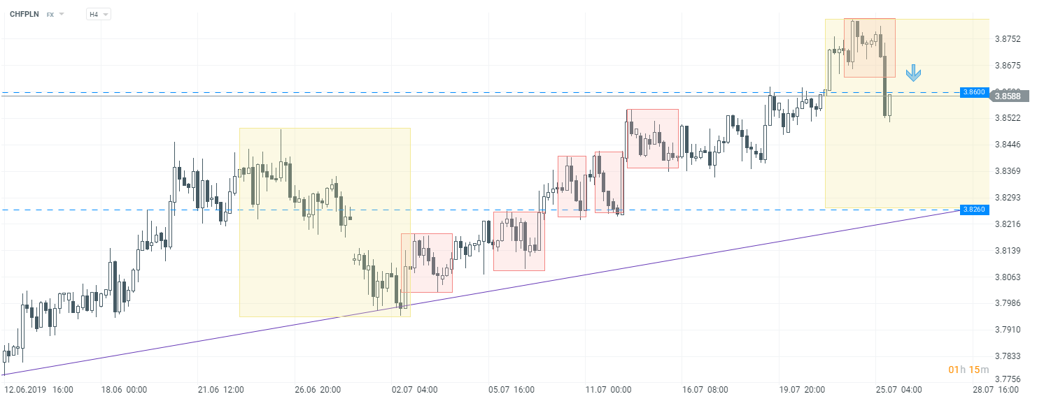 CHFPLN cofa po fałszywym wybiciu szczytów. Źródło: xStation5