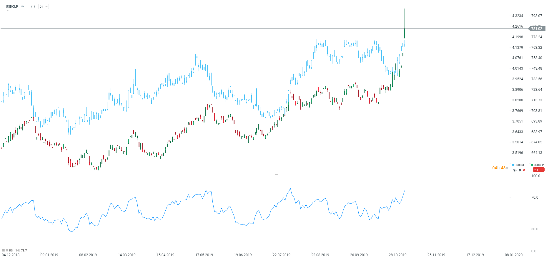 Chilijskie peso traciło dzisiaj w pewnym momencie nawet 4%. Przez moment jeden dolar kosztował aż 800 pesos. Źródło: xStation5