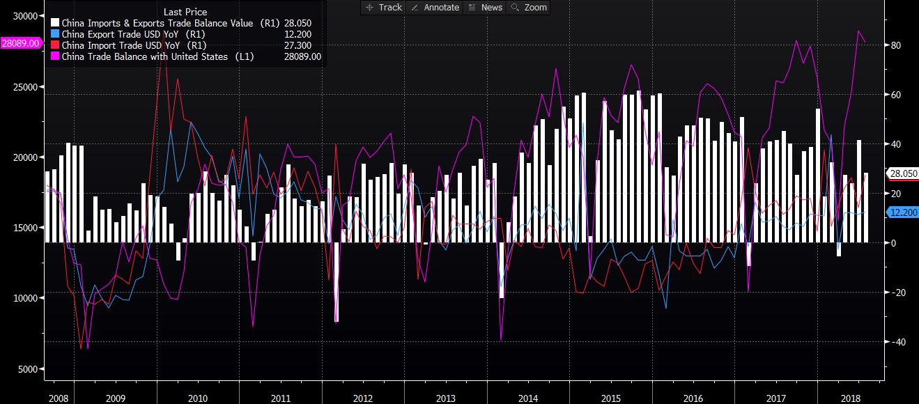 Dolar amerykański oddaje swoje poprzednie zyski, a chińskie parkiety kończą dzień w mieszanych nastrojach. W Chinach zostały opublikowane dane o handlu za lipiec. Jest to pierwsza ważna publikacja za lipiec, która pokazuje skutki nałożonych ceł na 34 mld dolarów 6 lipca. Nadwyżka handlowa skurczyła się do 28,05 mld dolarów z 41,47 mld dolarów. Import był głównym motorem takiego odczytu, ponieważ wzrósł o 27,3% z 14,1%, pokonując konsensus na poziomie 17%. W tym samym czasie eksport wzrósł o 12,2% z 11,2% w poprzednim miesiącu i zdołał pokonać konsensus na poziomie 10%. Te liczby mogą być naprawdę interesujące, ponieważ pokazują, że eksport wzrósł pomimo taryf, ponieważ ich wpływ mógł zostać złagodzony przez deprecjacje juana. W tym miejscu warto wspomnieć o wczorajszych chińskich rezerwach walutowych, które zmieniły się nieznacznie, po tym jak juan spadł. Sugeruje to, że władze chińskie nie były zbytnio zaniepokojone jego spadkiem, ponieważ pomógł on złagodzić negatywny wpływ taryf amerykańskich. Ostatecznie nadwyżka handlowa ze Stanami Zjednoczonymi zmniejszyła się tylko nieznacznie do 28,09 mld USD z rekordowej sumy 28,97 mld USD.