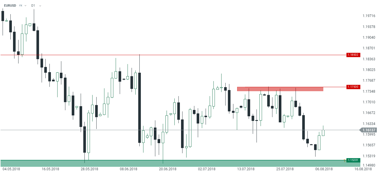 Po osiągnięciu dolnego zakresu konsolidacji EURUSD odbił dziś rano. Można przypuszczać, że ten ruch może zostać wydłużony do 1,1750, gdzie byki mogą ponownie zawiesić broń. Źródło: xStation5