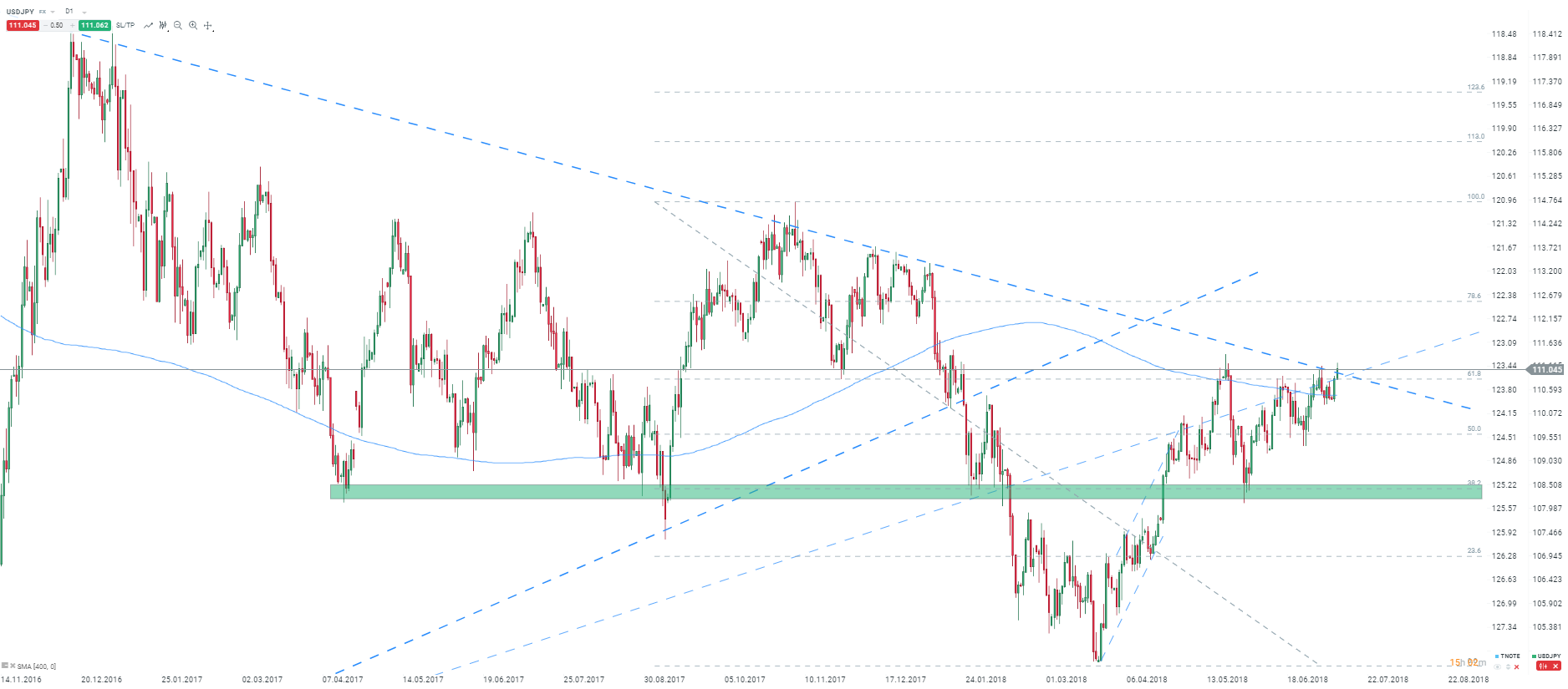 USDJPY znajduje się wciąż w ważnym miejscu oporu. Niemniej zamknięcie powyżej spadkowej linii trendu może oznaczać chęć na wyjście na wyższe poziomy. Kolejny silny opór to okolice poziomu 112,00. Źródło: xStation5