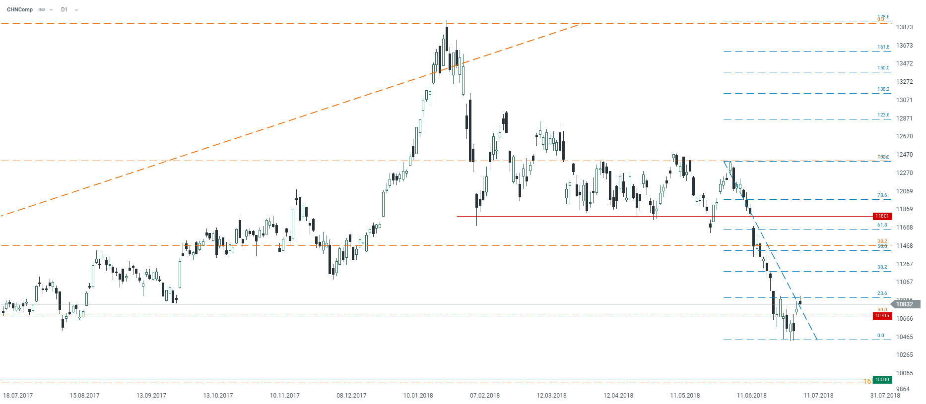 Hang Seng osiągnął zniesienie 23.3 ostatniej fali spadkowej, co może być pierwszą oznaką próby zmiany trendu. Niemniej, jeśli będzie to jedynie chwiloa korekta nie można wykluczyć kontynuacji cofnięcia, do kluczowego wsparcia przy 10000 punktów. Źródło: xStation5