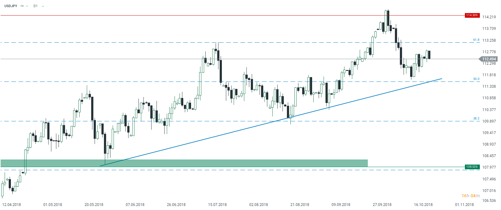 USDJPY spada o poranku głównie z powodu silnej przeceny na azjatyckich rynkach akcji. Najważniejszym wsparciem wydają się okolice niebieskiej linii trendu. Źródło: xStation5.