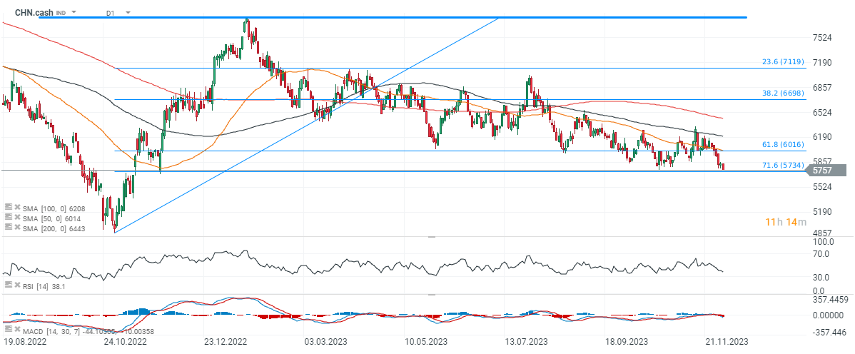 Patrząc na notowania kontraktów na CHN.cash widzimy, że wszystkie dotychczasowe próby wzrostów kończyły się podażą, a indeks testuje okolice rocznych minimów. Wybicie poniżej nich oraz 71,6 zniesienia Fibonacciego możę wskazywać na test 4900 punktów tj. poziomów wyprzedaży z listopada 2022 roku, gdy rynki panikowały wobec objęcia nowej kadencji rządów przez Xi Jinpinga.