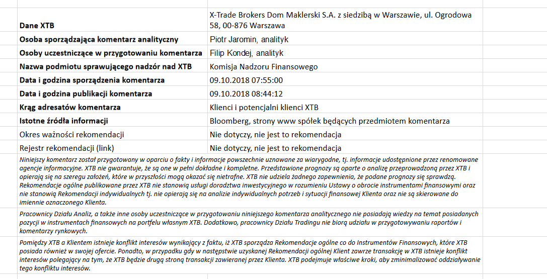 Ta publikacja handlowa jest informacyjna i edukacyjna. Nie jest rekomendacją inwestycyjną ani informacją rekomendującą lub sugerującą strategię inwestycyjną. W materiale nie sugerujemy żadnej strategii inwestycyjnej ani nie świadczymy usługi doradztwa inwestycyjnego. Materiał nie uwzględnia indywidualnej sytuacji finansowej, potrzeb i celów inwestycyjnych klienta. Nie jest też ofertą sprzedaży ani subskrypcji. Nie jest zaproszeniem do nabycia, reklamą ani promocją jakichkolwiek instrumentów finansowych. Publikację handlową przygotowaliśmy starannie i obiektywnie. Przedstawiamy stan faktyczny znany autorom w chwili tworzenia dokumentu. Nie umieszczamy w nim żadnych elementów oceniających. Informacje i badania oparte na historycznych danych lub wynikach oraz prognozy nie stanowią pewnego wskaźnika na przyszłość. Nie odpowiadamy za Twoje działania lub zaniechania, zwłaszcza za to, że zdecydujesz się nabyć lub zbyć instrumenty finansowe na podstawie informacji z tej publikacji handlowej. Nie odpowiadamy też za szkody, które mogą wynikać z bezpośredniego czy też pośredniego wykorzystania tych informacji. Inwestowanie jest ryzykowne. Inwestuj odpowiedzialnie.