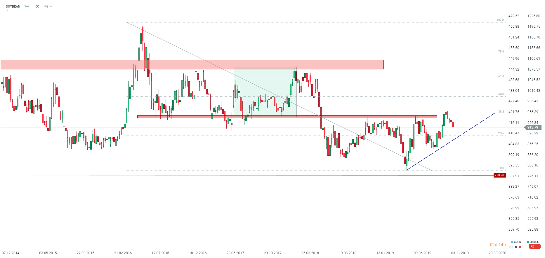Soja znajduje się aktualnie w fazie zniżkowej, co jest spowodowane ostatnim raportem WASDE i jednocześnie mieszanymi informacjami związanymi z zakupami surowca przez Chiny. Źródło: xStation5