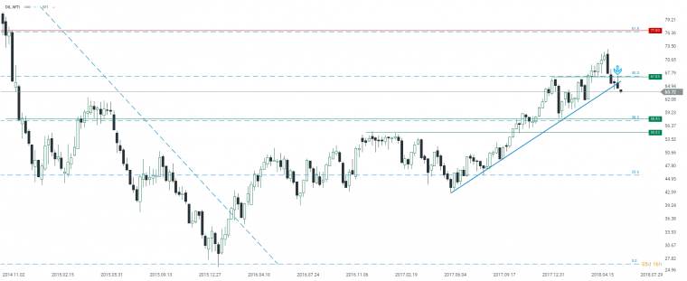Zarówno ceny ropy WTI jak i ropy Brent spadają na początku tygodnia. Z technicznego punktu widzenia cena WTI przebiła się poniżej linii trendu otwierając tym samym drogę do głębszej przeceny. Najbliższymi poziomami wsparcia mogą okazać się $62 i $58. Źródło: xStation5